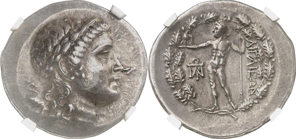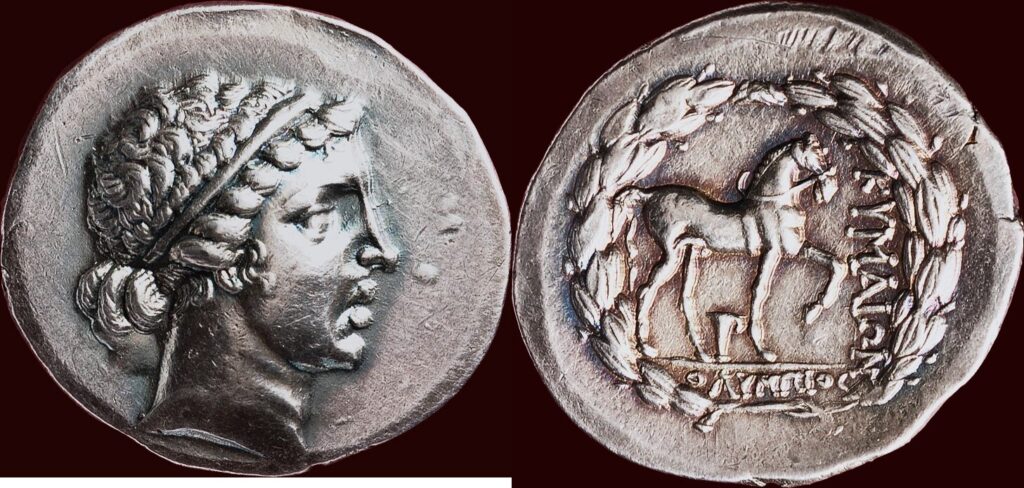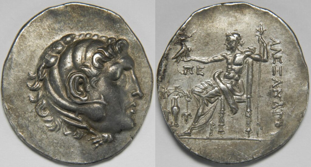 This tetradrachm belongs to the stephanophoric series, i.e. ” wreath bearer”, which were struck in a number of different mints – Aigai being one of the places that struck the fewest: only 4 obverse dies are listed in Ulla Westermark.