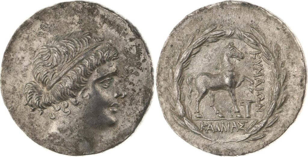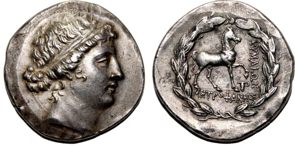 Rev: Horse standing right, left foreleg raised, one-handled cup (emblem of Kyme) below, ΚYMAIΩN to right, MHTPOΦANHΣ in exergue; all within laurel-wreath.