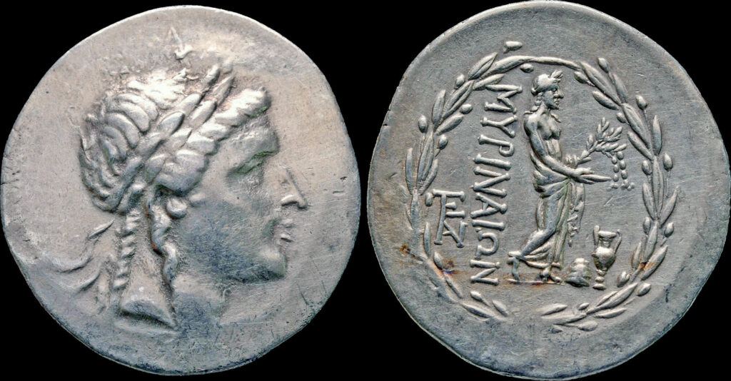 Rev: ΜΥΡΙΝΑΙΩΝ Apollo of Gryneium standing r., wearing laurel wreath, with himation draped around his lower torso, bare from the waist up; in r. hand, patera, in l., branch with two fillets. At feet, omphalos and amphora (city symbol), monogram behind; all within laurel wreath.